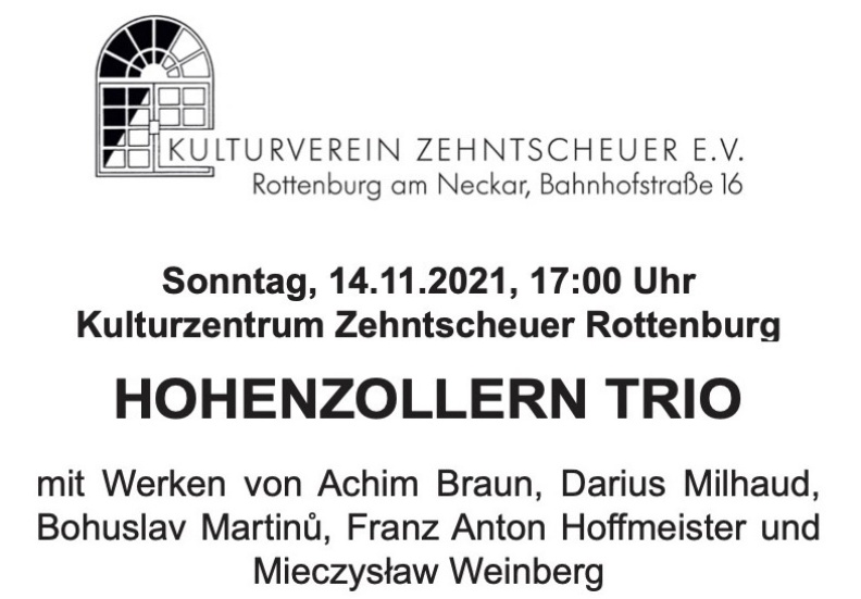 Das HohenzollernTrio spielt am Sonntag, den 20. März 2022 um 11:00 Uhr in der Alten Synagoge Hechingen ein Benefizkonzert zu Gunsten der Ukraine. Auf dem Programm stehen Sätze aus Streichtrios von Darius Milhaud, Jean Sibelius, Wolfgang Amadeus Mozart, Mieczyslaw Weinberg und Achim Braun. Karl-Heinz Rauch, ehemaliger Schulleiter der Alice-Salomon-Schule Hechingen, wird einführende Worte sprechen. Um Spenden für die Ukraine wird gebeten.